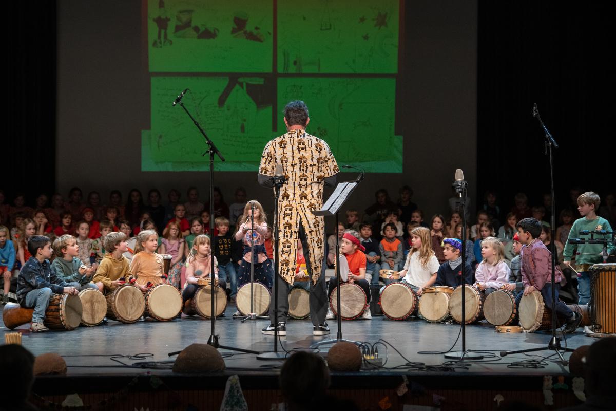 De geprojecteerde tekeningen op de achtergrond namen het publiek mee de wereld rond: van de ritmes van het leven in Afrika en de samoerais in Japan tot de melodieën van Nieuw-Zeeland en de glinsterende lichtjes van de Schelde.