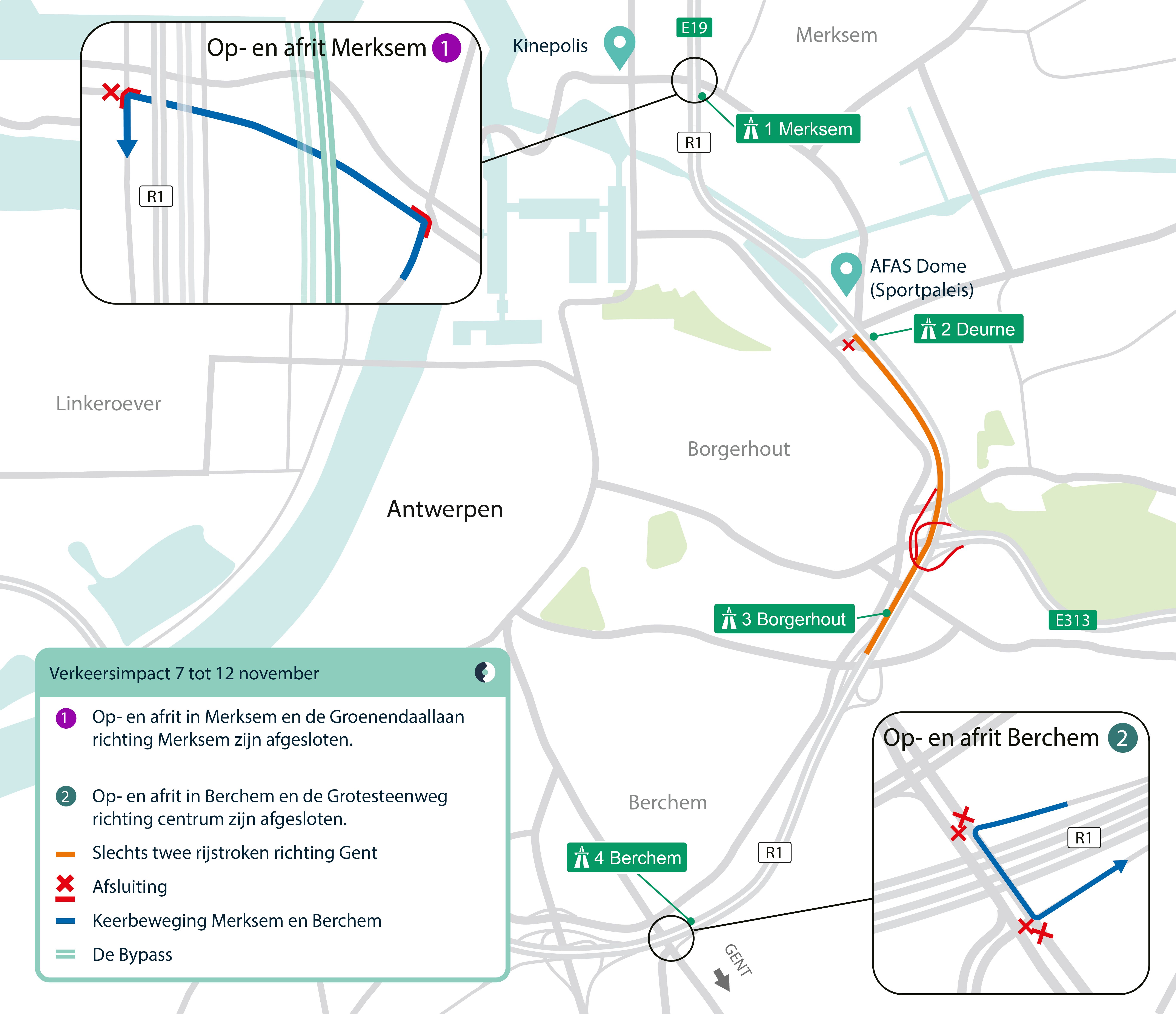 Daardoor is er vanaf vrijdag 7 november (22 uur) tot woensdag 12 november (5 uur) ernstige verkeershinder op de Antwerpse Ring tussen Merksem en Berchem, op toekomende snelwegen en op- en afrittencomplexen Merksem en Berchem. Deze werken hebben ook lokale impact op de op- en afrittencomplexen Berchem en Merksem + Groenendaallaan en Grotesteenweg.