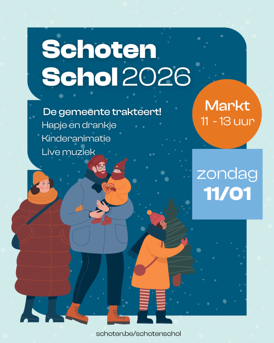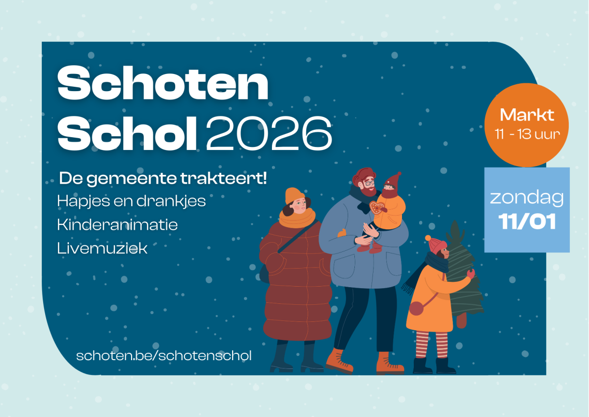 Het nieuwe jaar zetten we in met een goed feestje onder familie, vrienden en buren. Kom op zondag 11 januari 2026 naar het marktplein en wens elkaar het beste op ‘Schoten Schol’: de gratis openluchtreceptie voor alle Schotenaren!