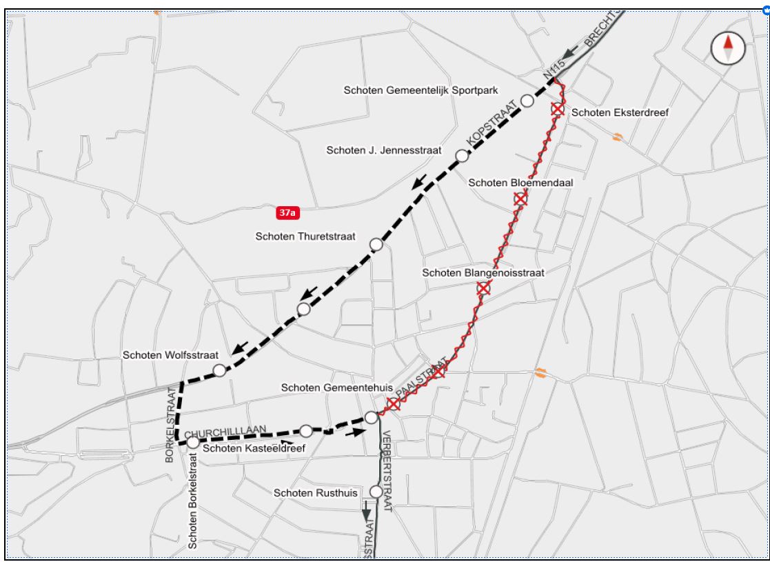 Niet bediende haltes: Eksterdreef, Bloemendaal, Blangenoisstraat, Th. V. Cauwenberghslei, Gemeentehuis