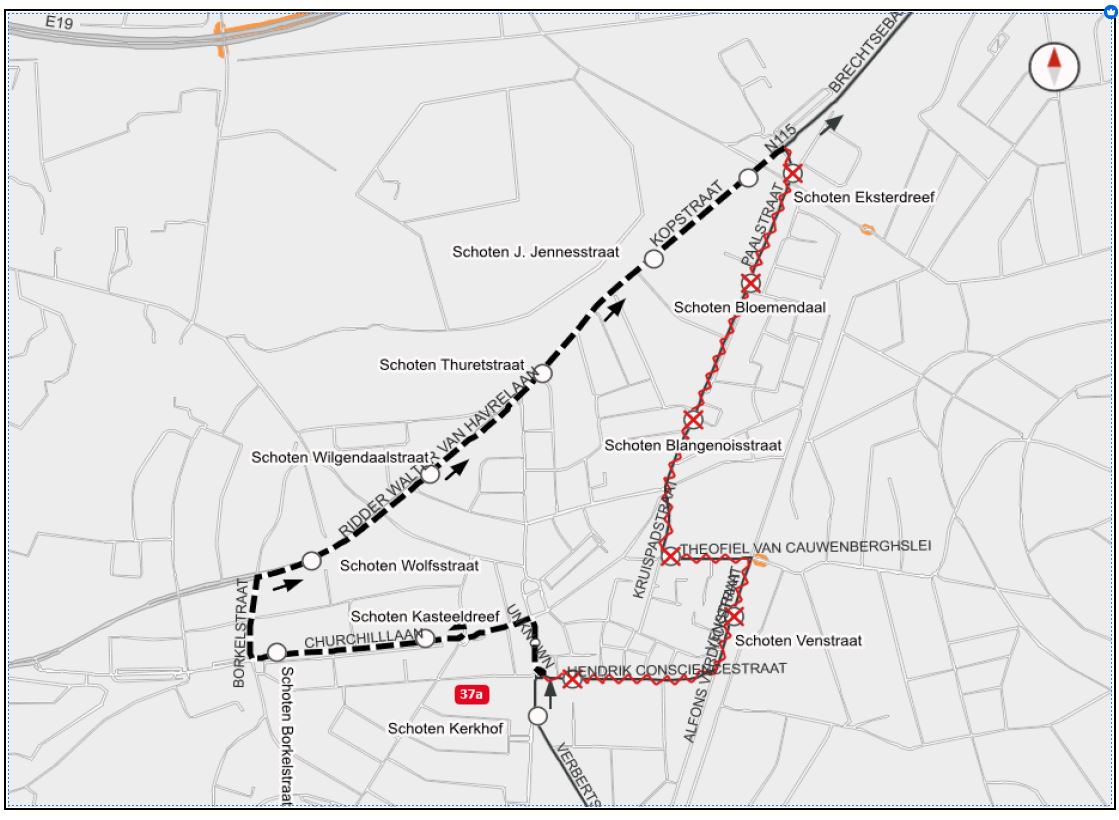 Niet-bediende haltes: Eksterdreef, Bloemendaal, Blangenoisstraat, Th. V. Cauwenberghslei, Gemeentehuis, Kasteeldreef, Borkelstraat