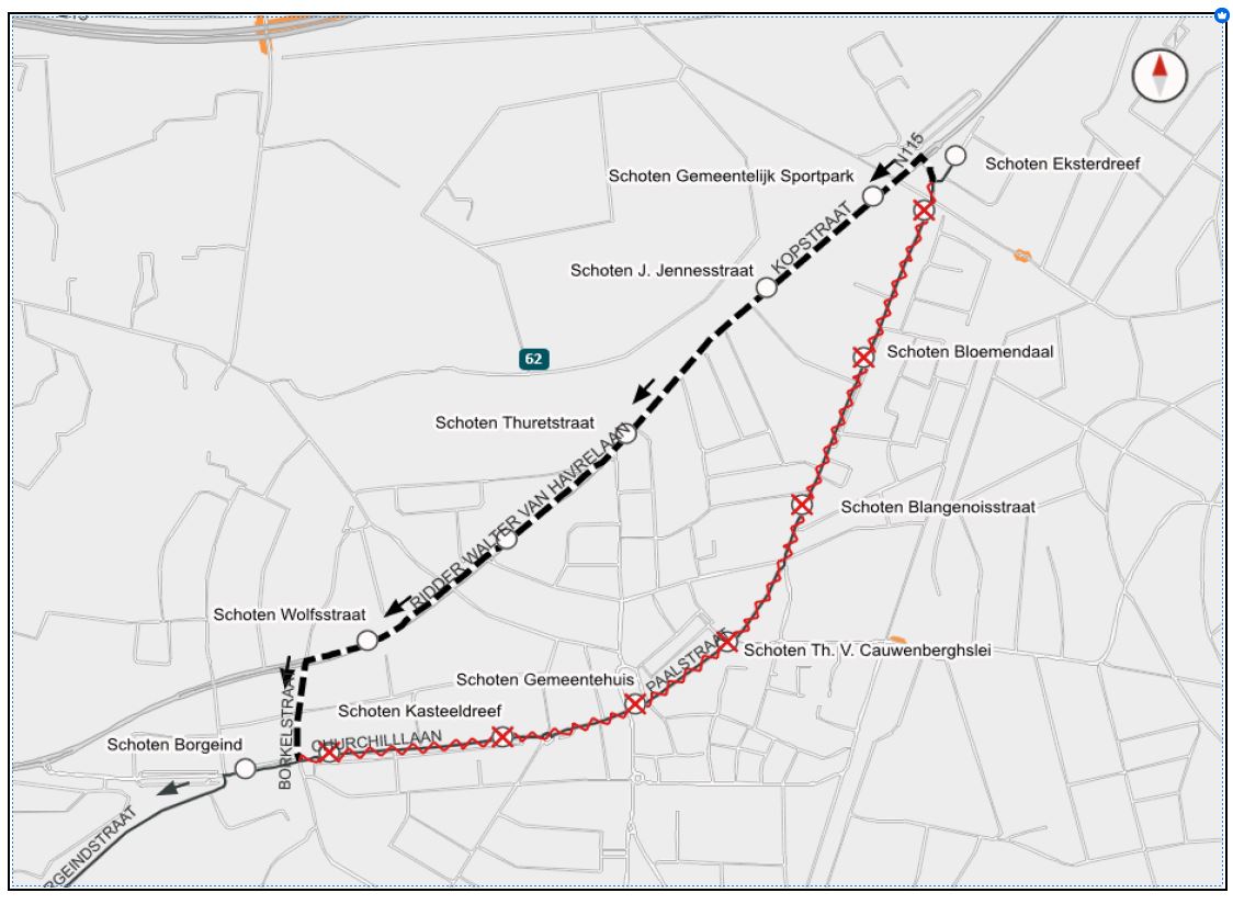 De Lijn voorziet een omleiding in beide richtingen via de Borkelstraat en de Kopstraat.