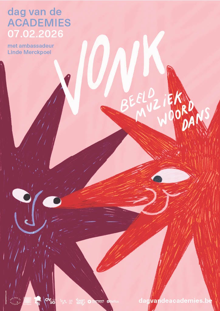 De Dag van de Academies is een jaarlijks event waarop alle academies voor deeltijds kunstonderwijs hun bruisende werking in de kijker zetten met beeld, muziek, woord en dans. Thema dit jaar is VONK, ambassadeur is Linde Merckpoel.