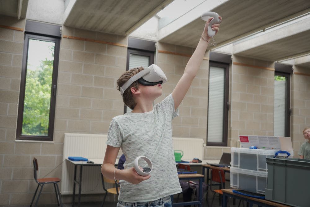 Virtual reality (VR) is razend populair, maar hoe wordt zo’n digitale wereld eigenlijk gemaakt? En ken je Augmented Reality (AR) al? Deze week draait helemaal rond deze digitale werelden. We gaan aan de slag met de app Delightex. In deze app kan je een bibliotheek met verschillende 3D-objecten vinden: dieren, personen, huizen, voertuigen,... om je eigen wereld te creëren. Je kan hier ook hele scenario’s en sets bouwen. Je kan ze simpel programmeren om interactieve acties te creëren, zoals een puzzel- of detectivespel! Na al je bouwwerk aan die digitale wereld, kan je die gaan verkennen met een echte VR-bril én een zelfgebouwde kartonnen VR-bril. Daarnaast onderzoeken we de AR-technologie. Wat is dat eigenlijk en wat is het verschil met VR? We gaan op onderzoek met onze tablet. Je zit dus niet de hele week achter een VR-bril, maar leert de virtuele wereld vanbinnen en vanbuiten kennen. Natuurlijk is er ook ruimte om bestaande games uit te proberen op de Meta Oculus bril.