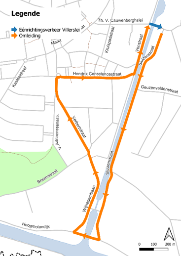 - Autoverkeer van de Villerslei naar het centrum moet de omleiding volgen via de Sluizenstraat, Wijnegembaan, Verbertstraat, Hendrik Consciencestraat en Venstraat.