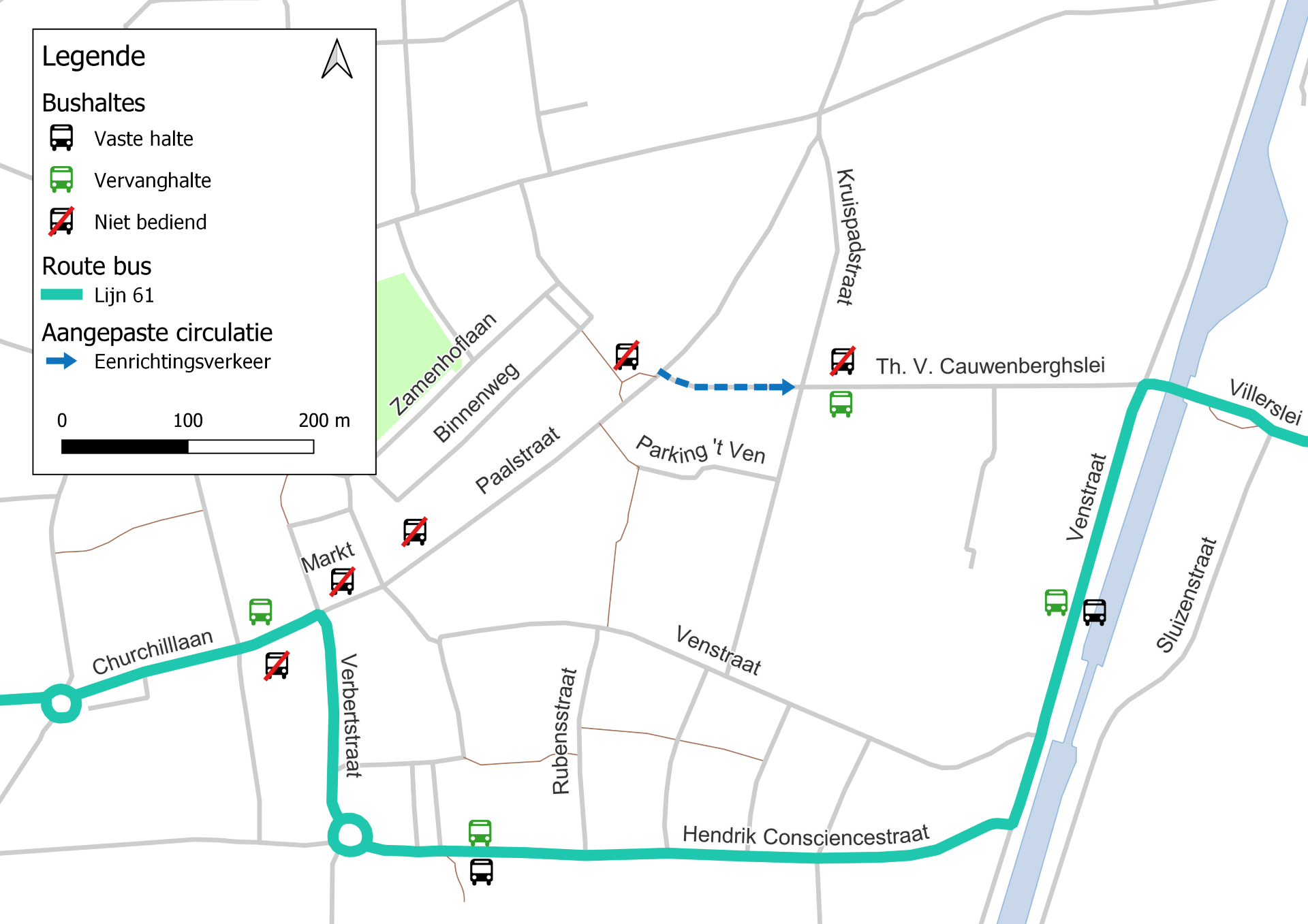 Bus 61 volgt de omleiding via de Verberstraat, Hendrik Consciencestraat en Venstraat. Er worden vervanghaltes voorzien.